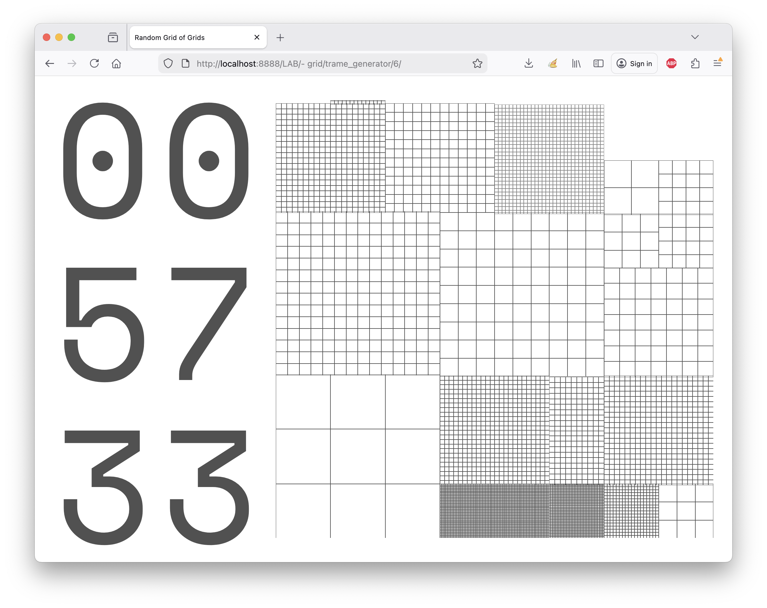 Horloge expérimentale. Une grille composée de cellules de taille différente, générée aléatoirement s’anime. À interval régulier une cellule disparait alors qu’une autre apparait. Voir l’horloge : https://blueingreen.fr/lab/grid/6/
