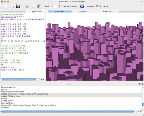 En ce moment, je joue avec Structure synth, un logiciel libre développé par Mikael Hvidtfeldt Christensen. De ses propres mots, Strucure synth est une application permettant de créer des strucures 3D à partir de règles données. C’est une version 3D de Context Free.